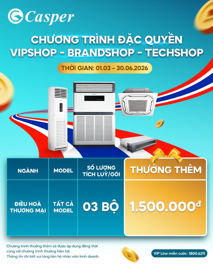 Casper Vietnam xin gửi tới quý khách hàng Chương trình đặc quyền dành cho VipShop – BrandShop – TechShop, áp dụng đối với ngành hàng Điều hoà thương mại
