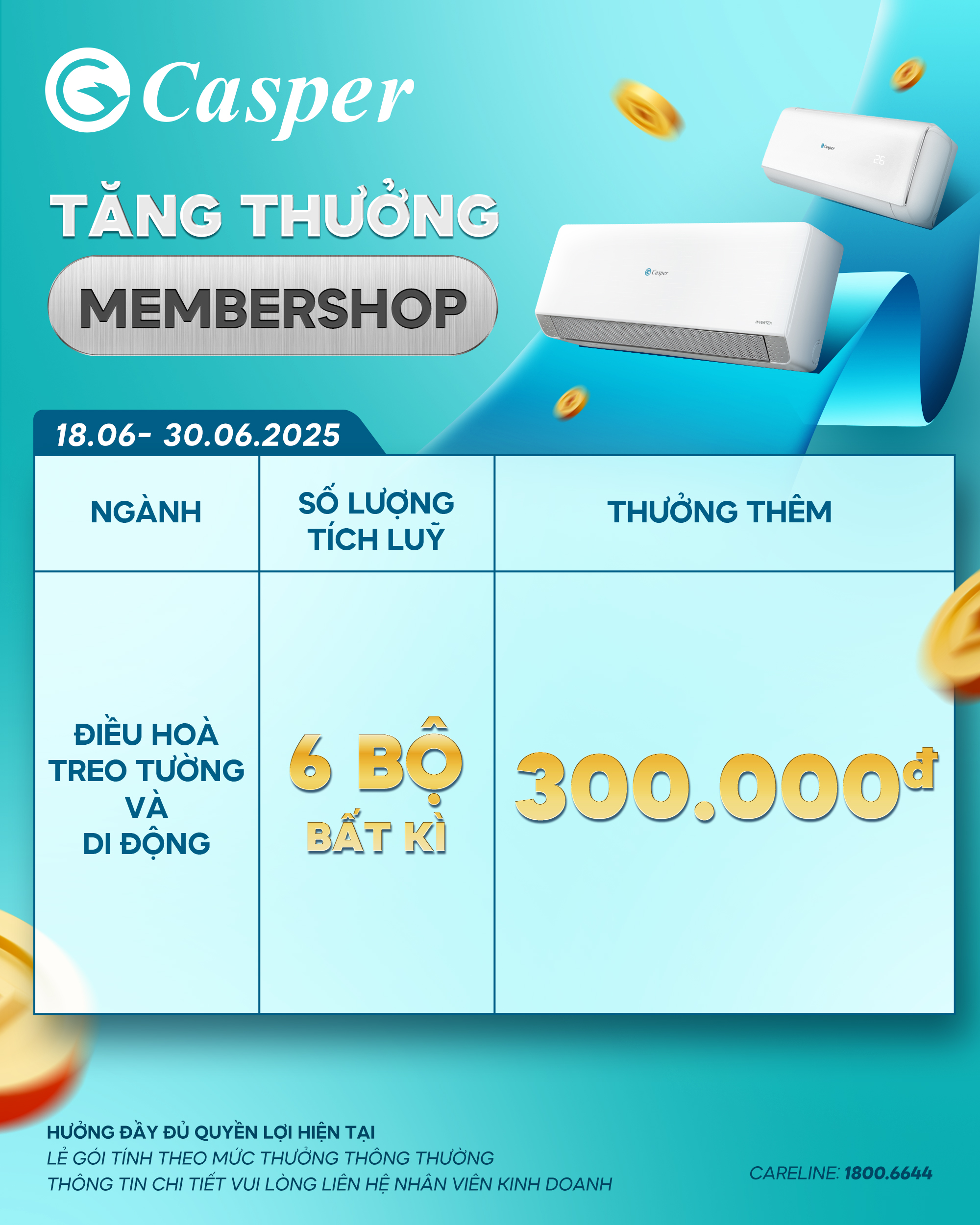 Casper Vietnam xin gửi tới quý khách hàng thông tin tăng thưởng dành cho MEMBERSHOP. Số lượng gói thưởng không giới hạn, áp dụng đối với ngành hàng Điều hoà treo tường và Điều hòa di động.