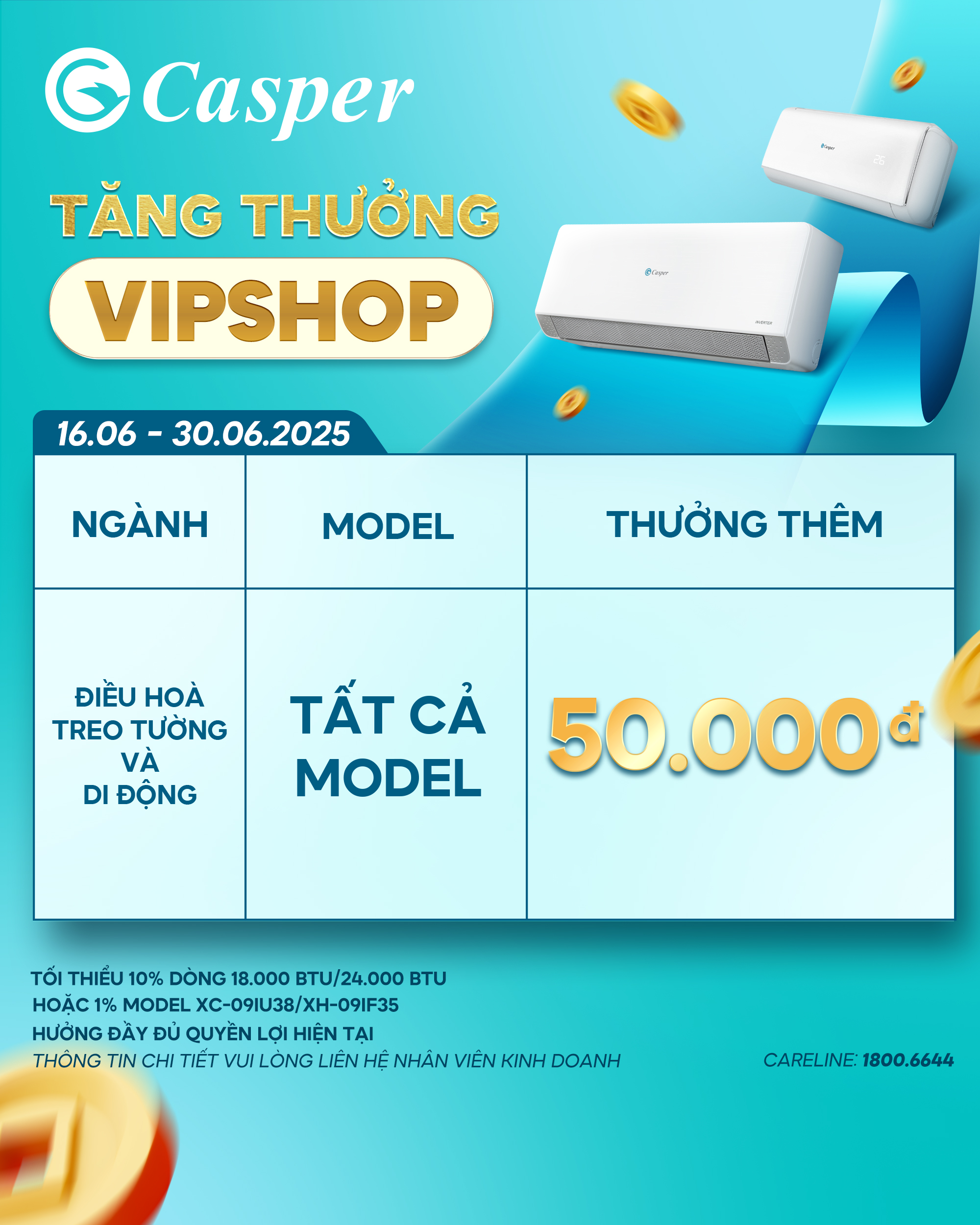 Casper Vietnam xin gửi tới quý khách hàng thông tin tăng thưởng dành cho VIPSHOP, áp dụng đối với ngành hàng Điều hoà treo tường và Điều hòa di động.