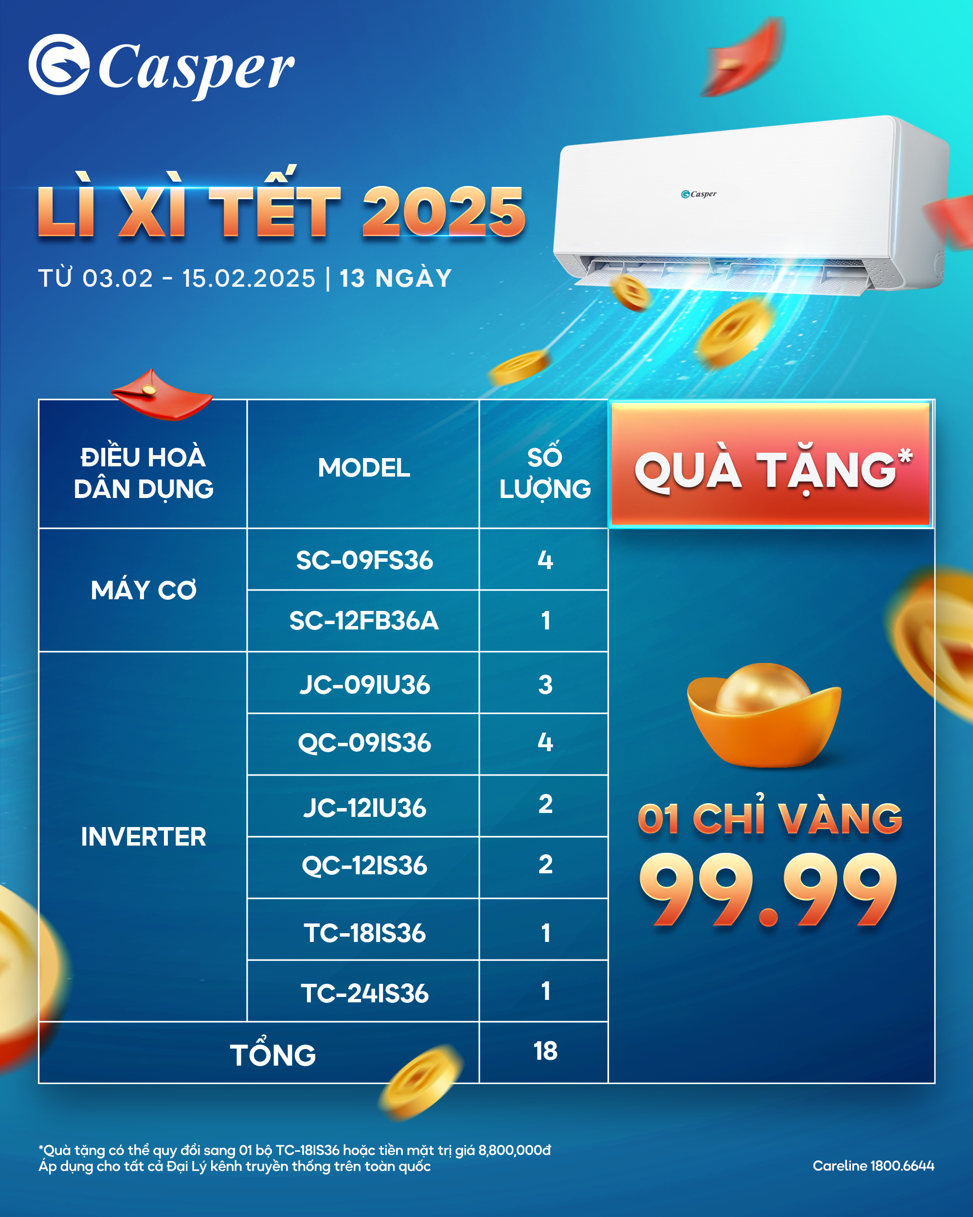 Đầu xuân năm mới, Casper Việt Nam xin gửi tới quý khách gói hàng Điều hoà với quà tặng lấy may siêu hấp dẫn – 01 CHỈ VÀNG 99.99!!!