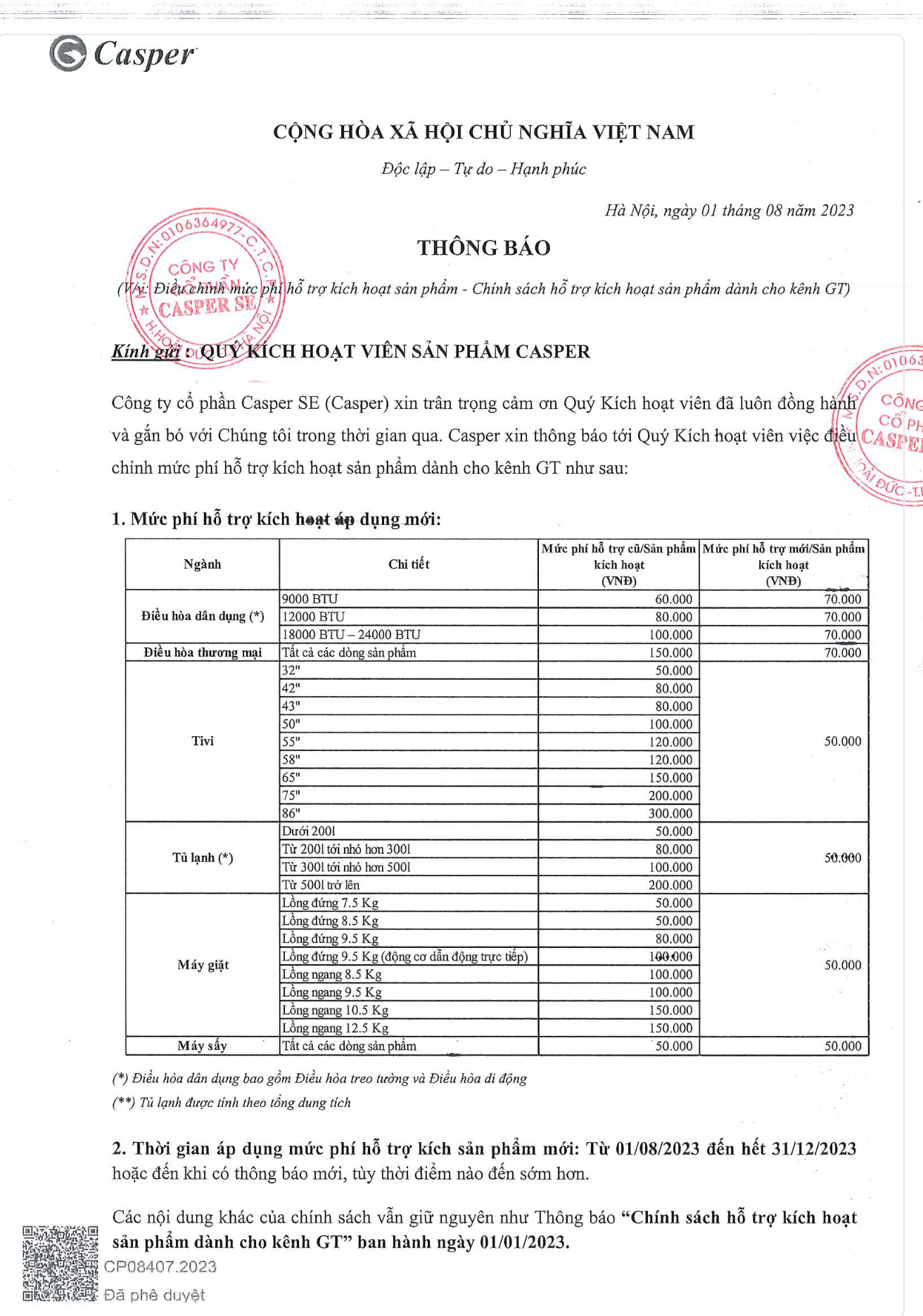 Công ty cổ phần Casper SE (Casper) xin trân trọng cảm ơn Quý Kích hoạt viên đã luôn đồng hành và gắn bó với Chúng tôi trong thời gian qua. Casper xin thông báo tới Quý Kích hoạt viên việc điều chỉnh mức phios hỗ trợ kích hoạt sản phẩm dành cho kênh GT như sau: