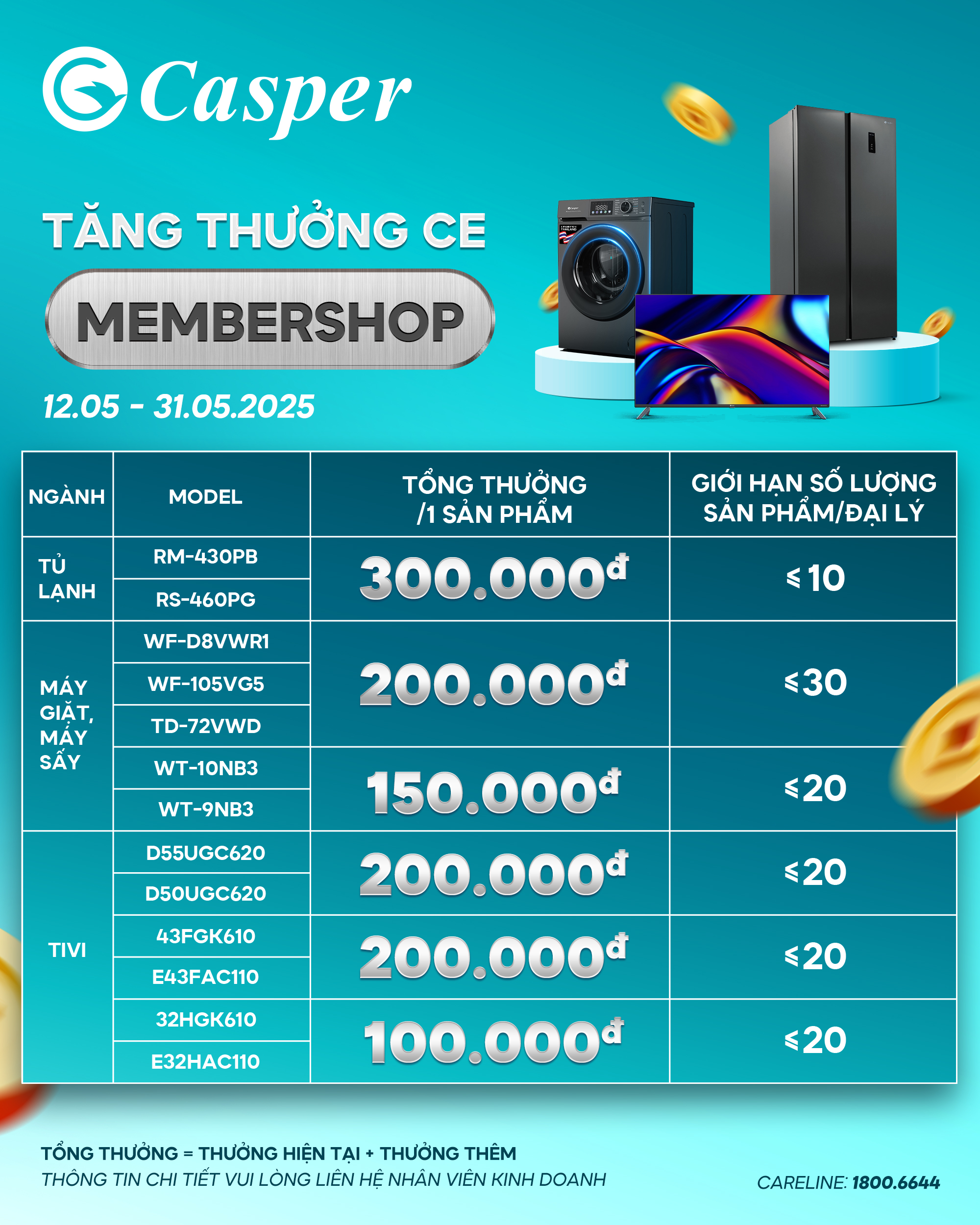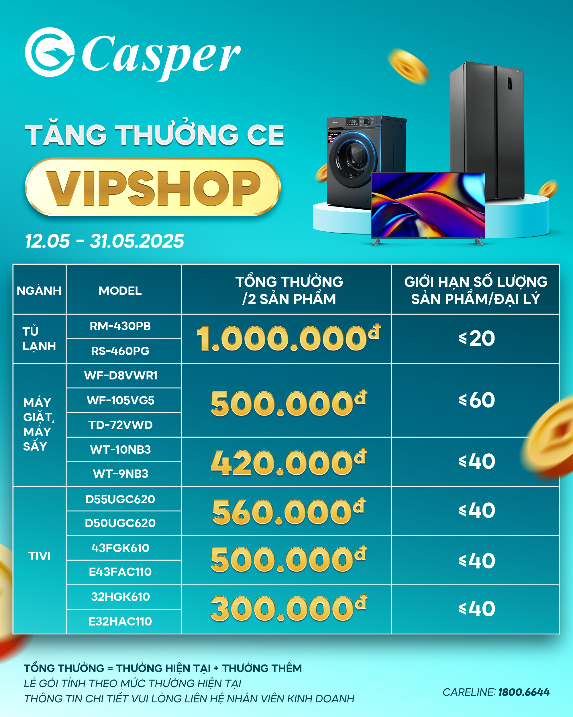 Casper Vietnam xin gửi tới quý khách hàng thông tin tăng thưởng dành cho VIPSHOP và MEMBERSHOP, áp dụng đối với ngành hàng Tủ lạnh, Máy giặt, Tivi.