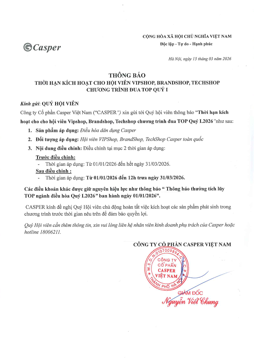 Công ty Cổ phần Casper Việt Nam (“CASPER”) xin gửi tới Quý hội viên thông báo “Thời hạn kích hoạt cho cho hội viên VIPSHOP, BRANDSHOP, TECHSHOP chương trình đua TOP Quý 1.2026” như sau:
