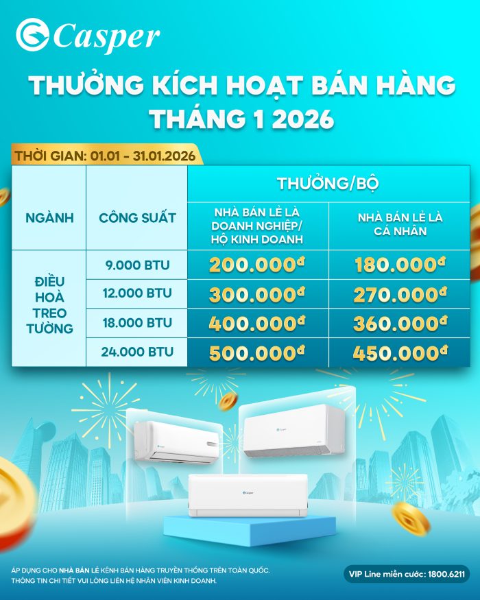 Chào năm mới 2026, Casper Vietnam xin gửi tới quý khách hàng thông tin tăng thưởng kích hoạt bán hàng, áp dụng đối với ngành hàng Điều hoà treo tường.