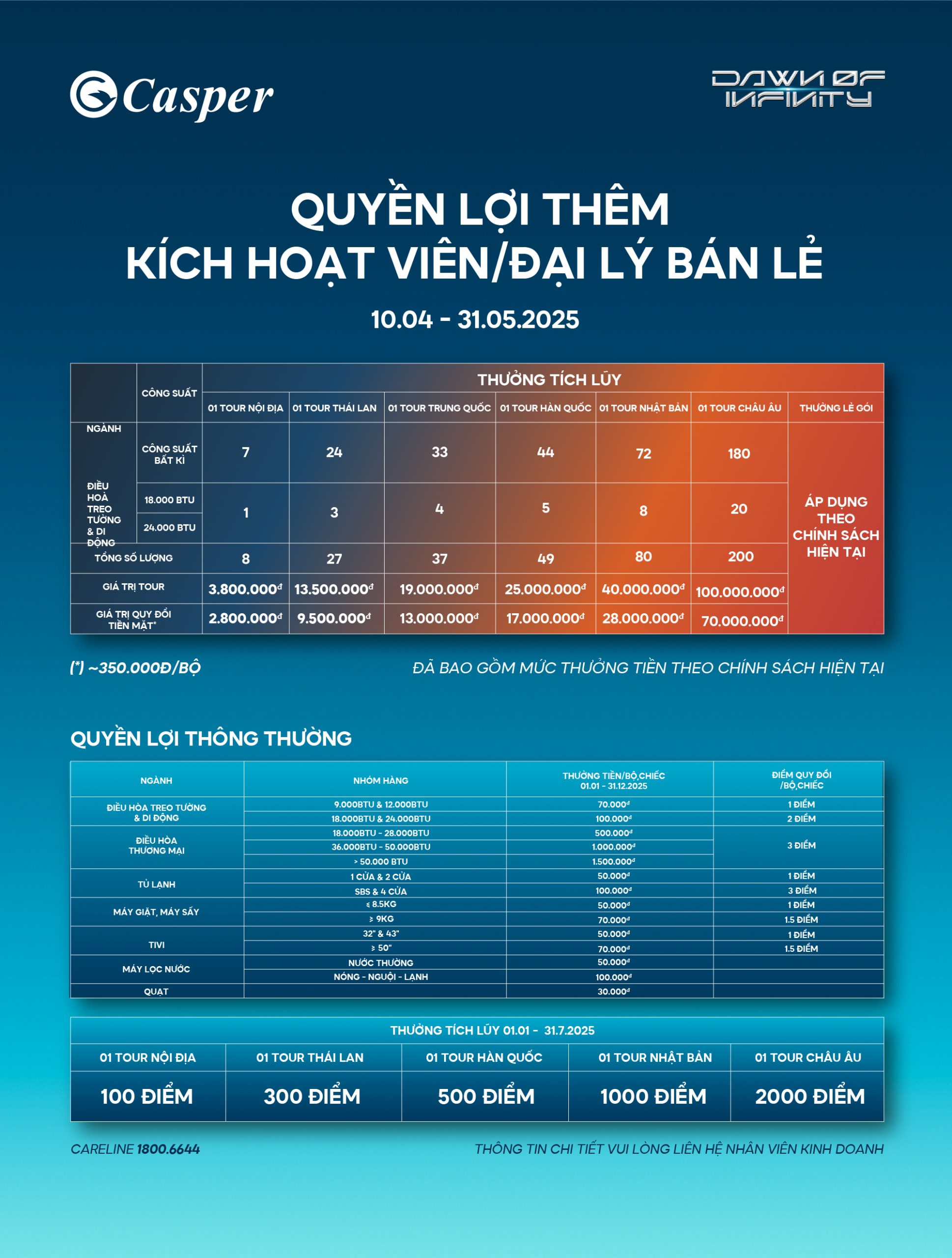 - Mức thưởng gói tích lũy bao gồm mức thưởng theo “Thông báo Chính sách hội viên Kích hoạt bán hàng Casper” năm 2025