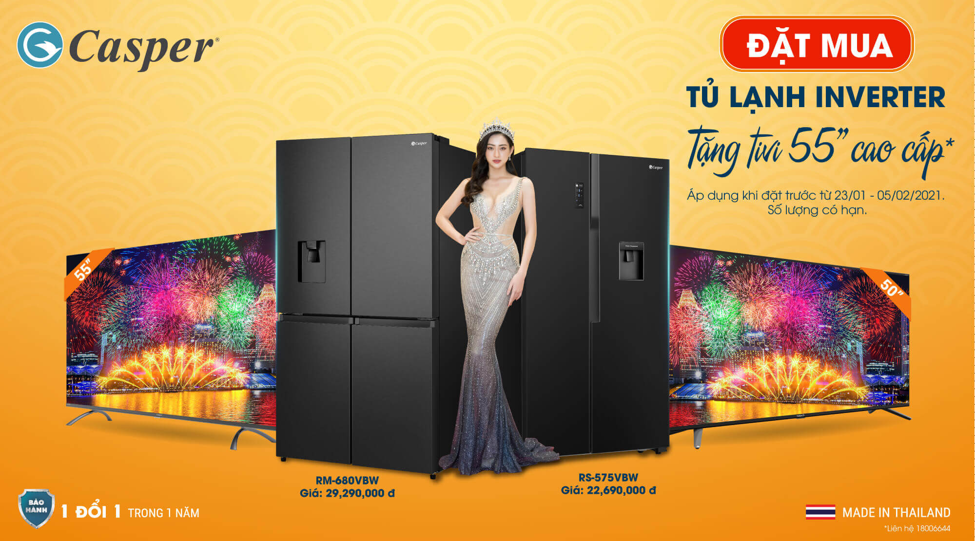 - Đặt trước 1 tủ lạnh Casper model RS-575VBW, khách hàng sẽ được tặng ngay 1 Smart TV Casper cao cấp 50”.