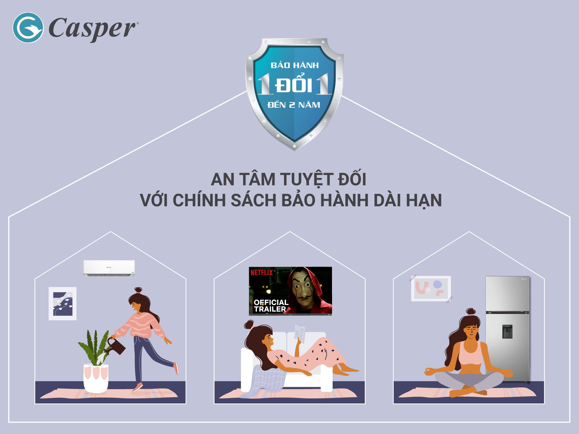 Được biết chế độ bảo hành 1 đổi 1 trong 1 năm đã được Casper tiên phong trong ngành điều hòa dân dụng, TV và máy nước nóng trong những năm vừa qua và đã tạo sự tin cậy từ hệ thống bán hàng cũng như hàng triệu người tiêu dùng trên cả nước.