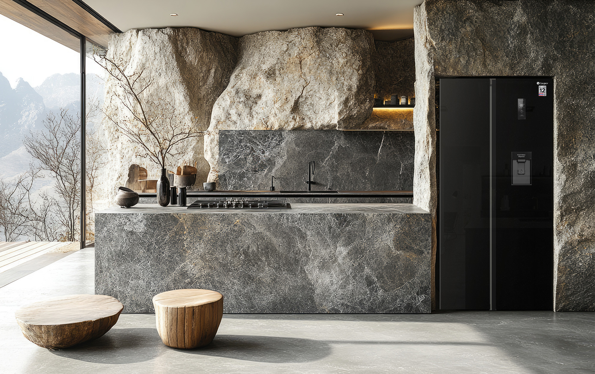 Cánh tủ được truyền cảm hứng từ đá kim sa đen Black Galaxy Granite, mang sắc đen tuyền điểm hoa văn tinh tế, trở thành điểm nhấn nổi bật cho căn bếp sang trọng. Thiết kế bằng kim loại phủ sơn cao cấp tăng tính thẩm mỹ và tạo chiều sâu cho không gian sống của gia đình.